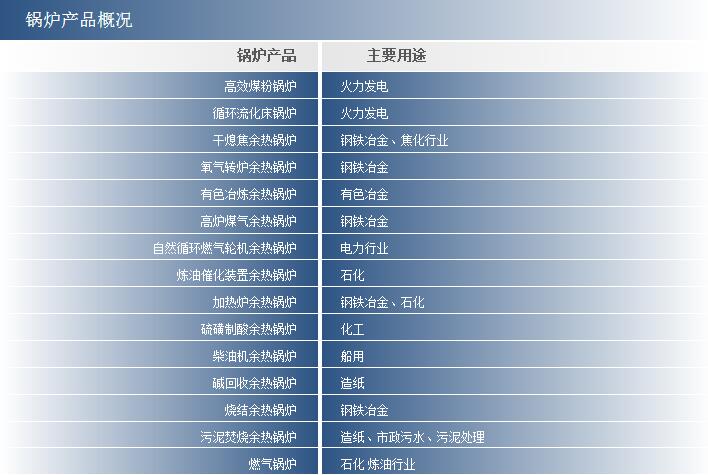 鍋爐業務專注于廢熱、余熱利用系統解決方案、余熱回收成套裝置設計、安裝、運行、EPCM,主要鍋爐品種有:高效煤粉鍋爐、循環流化床鍋爐、煤氣化余熱鍋爐、干熄焦余熱鍋爐及余熱回收系統、氧氣轉爐余熱鍋爐及其余熱回收系統、高爐煤氣余熱鍋爐、加熱爐余熱鍋爐、有色冶煉余熱鍋爐、硫磺制酸余熱鍋爐、煉油催化裝置余熱鍋爐、燒結余熱鍋爐、自然循環燃氣鍋爐(HRSG)、BFB造紙污泥焚燒鍋爐等等。