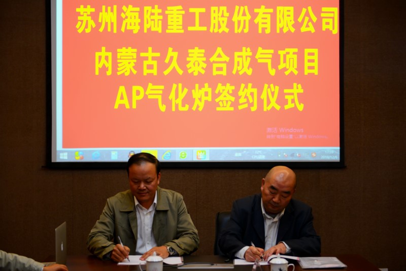 2018年12月6日下午,在海陸重工會議室,空氣化工產品(中國)投資有限公司與蘇州海陸重工股份有限公司,舉行久泰合成氣項目AP氣化爐簽約儀式,AP公司采購總監戴曉輝與海陸重工鍋爐事業部總經理陳吉強分別在簽約書上簽字